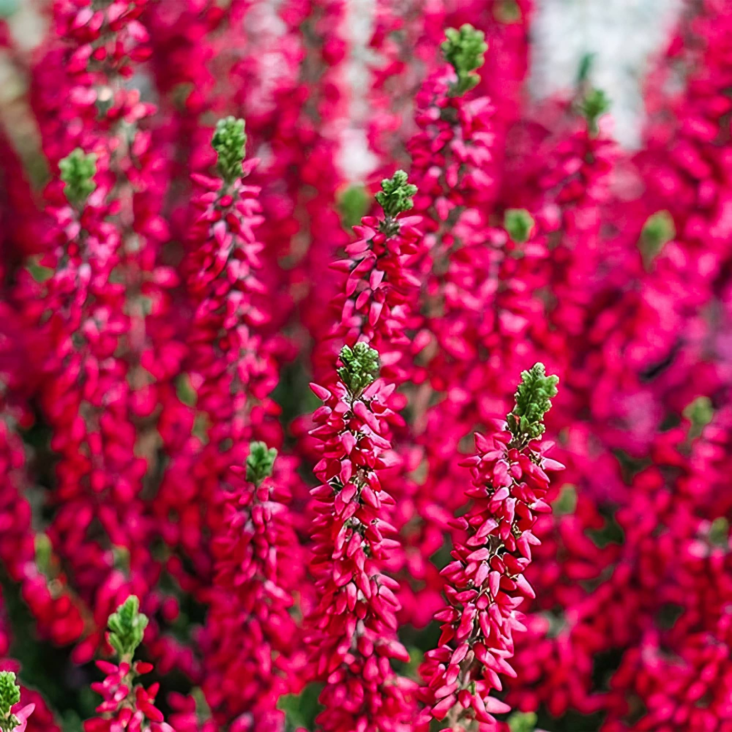 Czerwony wrzos o pączkowym kwiatostanie to niezwykle efektowa odmiana wrzosu pospolitego, która wyróżnia się głęboką czerwoną barwą swoich kwiatów oraz bardzo długim okresem dekoracyjności. Swój długi okres kwitnienia roślina zawdzięcza kwiatom, które nigdy nie otwieraja się w pełni, pozostając przez cały czas w formie pąków, zachowując swój intensywny kolor przez wiele tygodni. Ciemnoczerwone pąki pięknie kontrastują z drobnymi, zimozielonymi liśćmi. Wrzos przyciąga wzrok, każdego gościa ogrodu oraz wprawdza do ogrodowej przestrzeni wyrazisty i ciepły akcent. Tworzy spójne kompozycje z jesienną aurą, innymi wrzosami oraz kolorowymi roślinami.